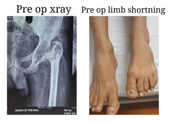 This was a challenging case due to the chronic arthritic hip and associated soft tissue contractures. We performed an uncemented total hip replacement with subtrochanteric osteotomy. The procedure proceeded as planned: the limb length discrepancy was corrected, and the patient was mobilized within 24 hours. He was discharged after four days, pain-free, and walking with support.